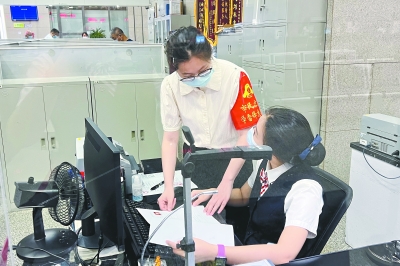 市交通運輸局行政審批處支部黨員范楚晗(左)指導窗口人員辦理“跨省通辦”。