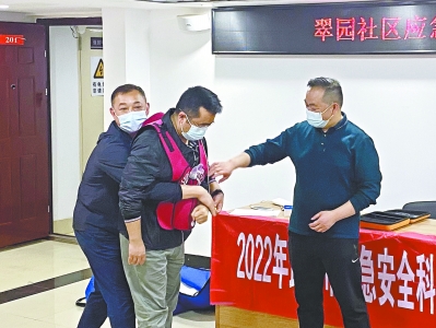 市應急管理局黨員白海峰(左二)、許華慶(左一)在社區模擬演示海姆立克急救法。
