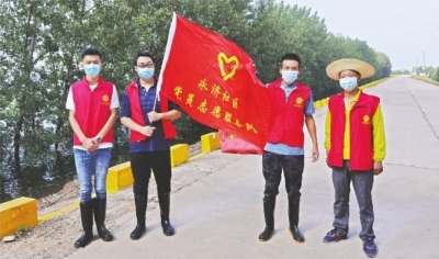 永濟(jì)社區(qū)第一書記雷楫舟(左二)帶領(lǐng)志愿者上堤抗洪。