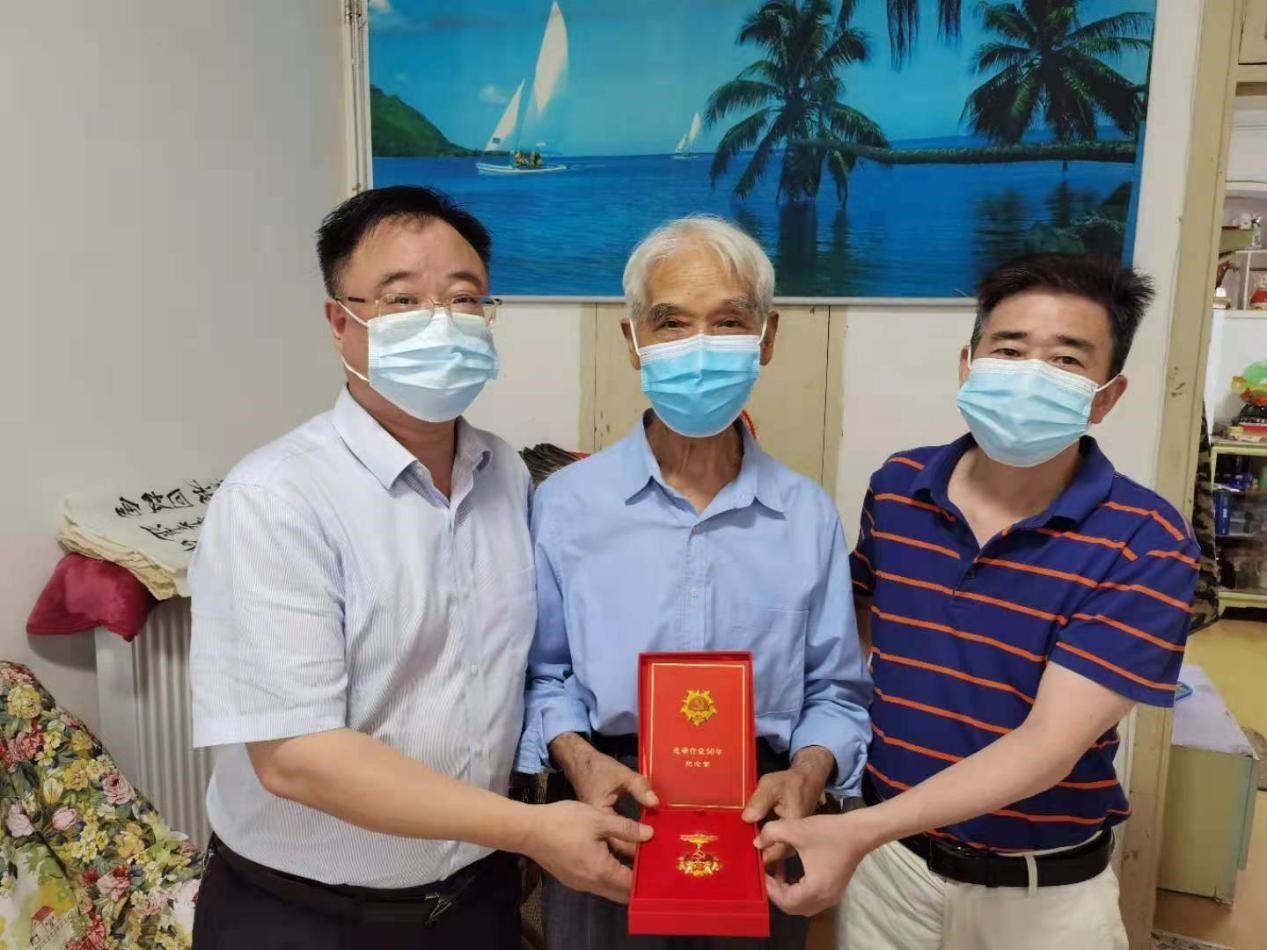 在建黨100周年來臨之際,6月17日下午,市委政研室副主任、機關黨委書記劉永明一行3人,來到老黨員吳正才家中,親手把“光榮在黨50年”紀念章送到老黨員手中。