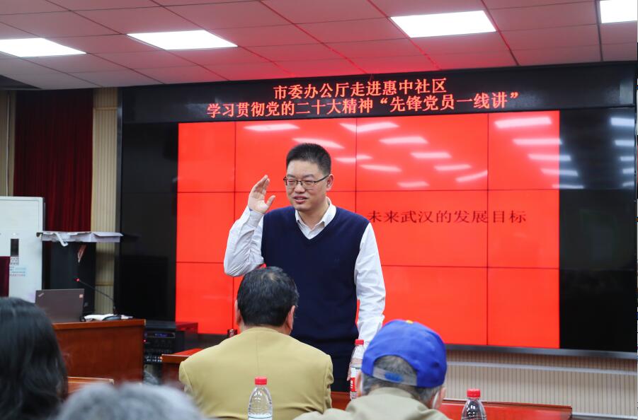 3月10日下午,市委辦公廳走進江岸區勞動街惠中社區開展學習貫徹黨的二十大精神“先鋒黨員一線講”宣講活動。市委辦公廳綜合處副處長丁力以“新時代英雄城市武漢的創新實踐”為題作了專題宣講,惠中社區黨員群眾代表60余人聆聽了宣講。