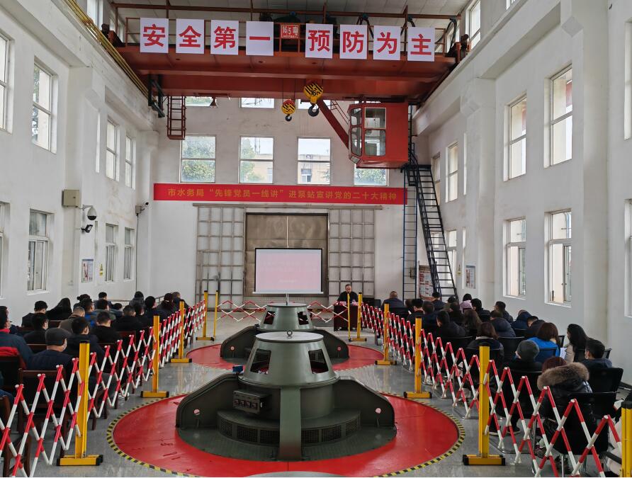 深入一線 共譜防澇治水新篇章。2月24日,市水務(wù)局二十大精神宣講團(tuán)走進(jìn)武漢市湯遜湖泵站開展學(xué)習(xí)宣傳貫徹黨的二十大精神專題宣講報(bào)告會(huì)。市湯遜湖泵站管理處及大軍山泵站管理處黨員代表、職工代表共計(jì)50余人參加活動(dòng)。宣講隊(duì)成員以“創(chuàng)新引領(lǐng),美麗守護(hù),共繪萬(wàn)里長(zhǎng)江新圖景”為主題,對(duì)習(xí)近平總書記在黨的二十大報(bào)告中關(guān)于生態(tài)環(huán)境保護(hù)理念進(jìn)行了深入解讀。“泵管家”紛紛表示將以此次宣講會(huì)為契機(jī),繼續(xù)深入學(xué)習(xí)貫徹黨的二十大精神,努力學(xué)習(xí)、積極工作、勇于實(shí)踐,為水務(wù)事業(yè)做出新的更大貢獻(xiàn)。