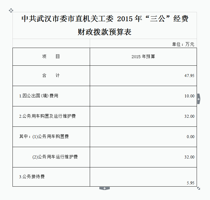 中共武漢市委市直機關工委2015年“三公”經費財政撥款預算表