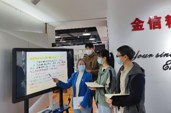 3月7日,市科技局黨員陳潔(左一)就高新技術企業申報為企業作輔導。