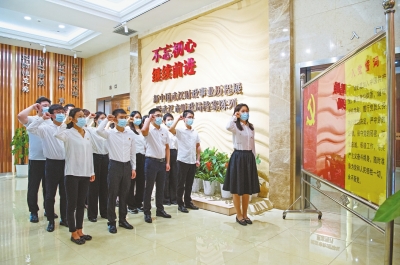市財政局的黨員干部在財政事業展墻下重溫入黨誓詞。