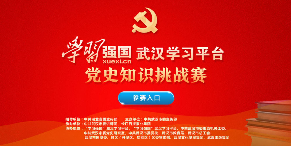 “學(xué)習(xí)強(qiáng)國”武漢學(xué)習(xí)平臺(tái)黨史知識(shí)挑戰(zhàn)賽活動(dòng)由湖北省委宣傳部指導(dǎo)、武漢市委宣傳部主辦,由武漢市委講師團(tuán)、長(zhǎng)江日?qǐng)?bào)報(bào)業(yè)集團(tuán)承辦。“學(xué)習(xí)強(qiáng)國”湖北學(xué)習(xí)平臺(tái)、“學(xué)習(xí)強(qiáng)國”武漢學(xué)習(xí)平臺(tái)、市委市直機(jī)關(guān)工委、市委黨史研究室、市委黨校、市教育局、市總工會(huì)、市國資委、各區(qū)(開發(fā)區(qū)、功能區(qū))黨委宣傳部、武漢文化發(fā)展集團(tuán)、武漢出版集團(tuán)協(xié)辦。