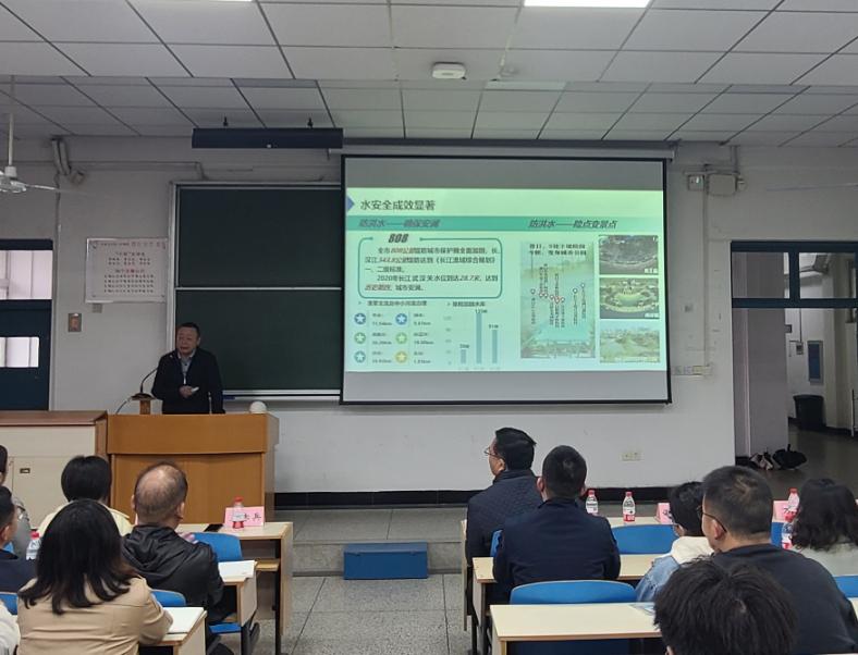 在東十二教學樓,王赤兵副局長以《武漢市流域水環境治理的探索與實踐》為題,為該院給排水科學與工程專業的師生及我局黨員講授了一堂生動的水環境治理專題輔導課。課程從我市豐富的水資源及“優于水、憂于水”的背景著手,深入淺出地闡述了我市從點位消污、建管納污到流域治污的歷程;通過對東湖、“三湖三河”等河湖治理案例的介紹和講解,詳細剖析了當前我市在施行流域河湖長制、開展流域水環境治理方面所面臨的問題和挑戰,結合習近平生態文明思想、習近平新時代治水方針及省第十二次黨代會精神,提出了下階段流域治理與統籌發展的思路。