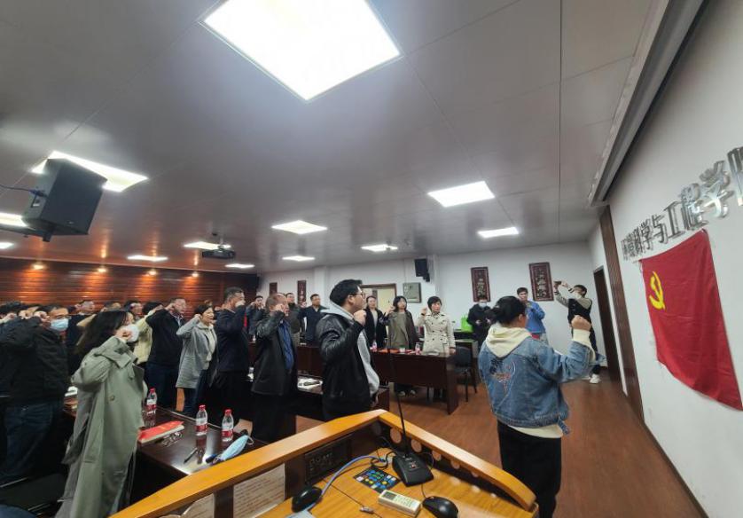 在環境科學與工程學院二樓會議室,在鮮艷的黨旗下,全體黨員高舉右手重溫了入黨誓詞,現場莊嚴鄭重,慷慨激昂,宣誓聲鏗鏘有力。